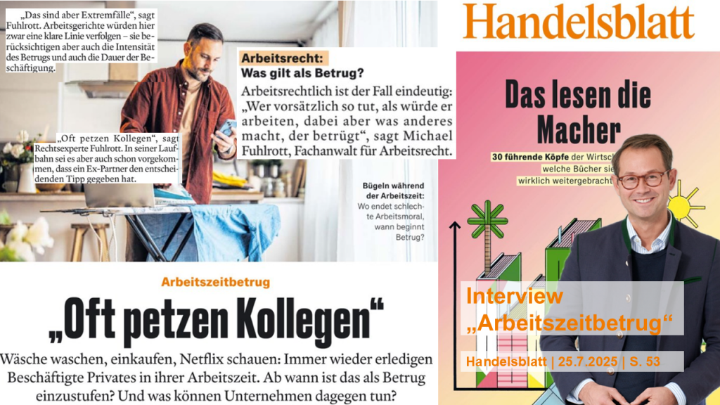 Der Beitrag „Oft petzen Kollegen“ (Handelsblatt, v. 25.7.2025, S. 53) geht der Frage nach, welche arbeitsrechtlichen Konsequenzen Arbeitszeitbetrug nach sich ziehen kann. Arbeitsrechtler Prof. Dr. Michael Fuhlrott stand als Experte für eine arbeitsrechtliche Einschätzung und Interviewpartner zur Verfügung.