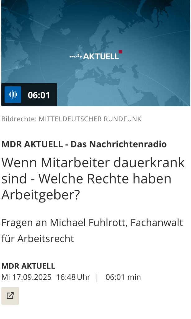 Prof. Dr. Michael Fuhlrott ordnet für MDR Aktuell (v. 17.9.2025) Presseberichte ein, wonach im Rostocker Rathaus Krankenstände weit über den Durchschnitt liegen. Im Interview erläutert er die Anforderungen und Voraussetzungen krankheitsbedingter Kündigungen und den Umgang hiermit aus Arbeitgebersicht.
